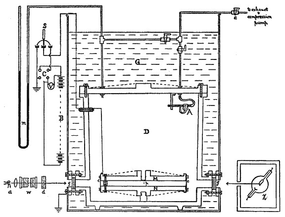 Oil Drop Experiment: Diagram of the experimental setup in Millikan’s original 1913 paper. (Source: Wikipedia)
